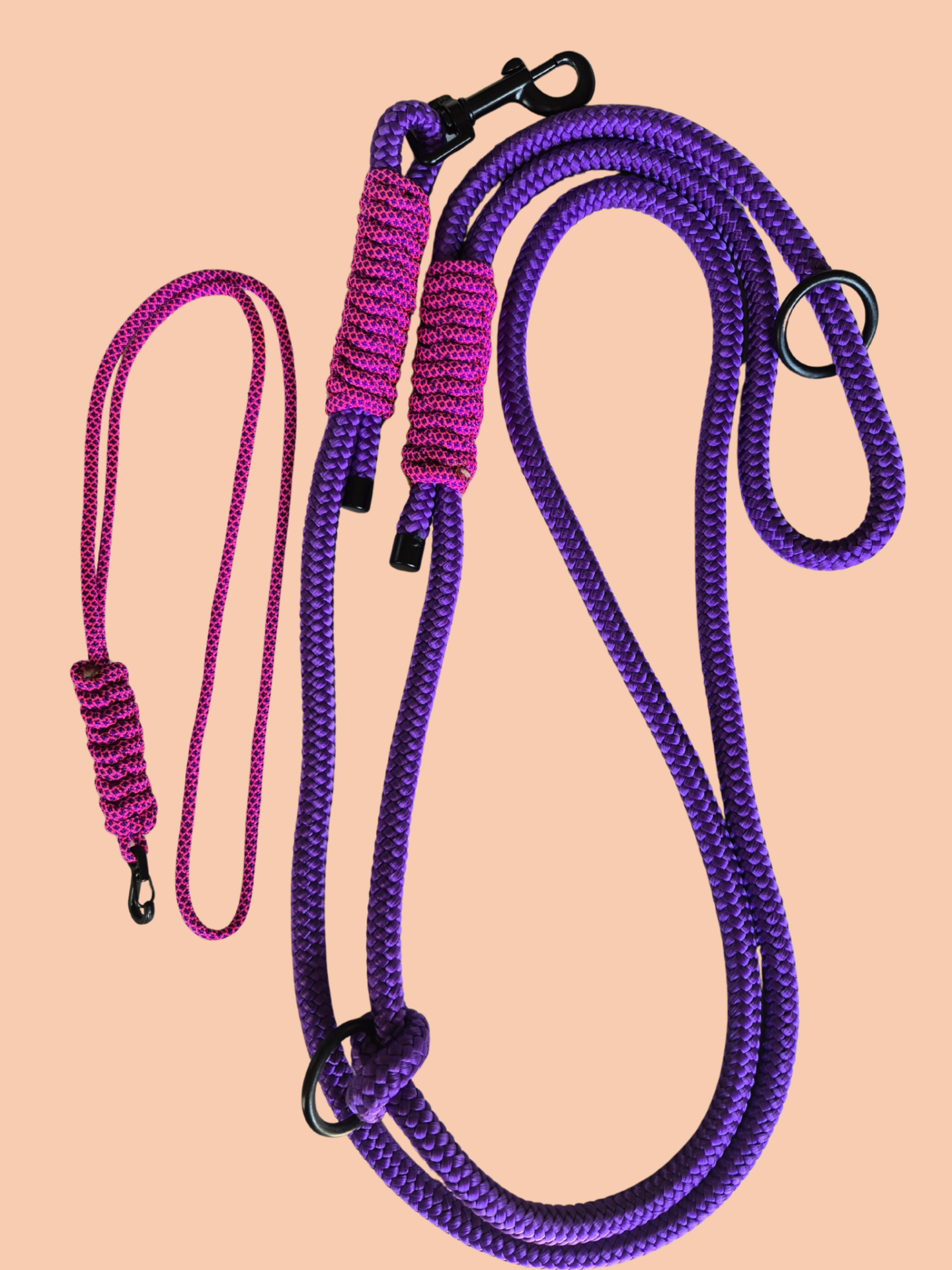 Håndlagde kobbel etter mål i sterke, glade sommerfarger. Velg mellom ulike fargekombinasjoner og lengder for et unikt og iøynefallende uttrykk. Alt lages i samråd, slik at kobbelet passer perfekt til deg og hunden din. Det er også mulig å få laget en matchende fløytesnor i samme stil.